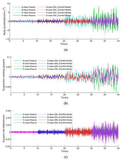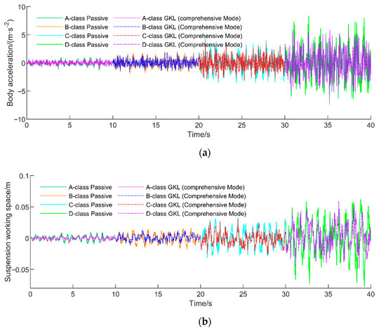 Using the weighting coefficients list in Table 10, active suspension control with the GKL algorithm is simulated by changing the road conditions and performance modes. The former GA-LQR control is also illustrated for comparison.