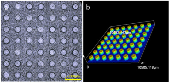 Observation of the top surface of a micro stamp using a laser microscope. (a) Optical imaging of a microstamp; (b) 3D image by a laser.
