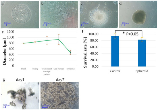 Bright-field image of HepG2 cultured on Matrigel dots and chart of size on every stage. (a) Stamped ECM (Matrigel) on the fluoropolymer surface. (b) HepG2 cells 1 day after seeding. (c) HepG2 cells grown to a colony of the same size as that of the Matrigel pattern on day 7. (d) Day 14 spheroids derived from detached HepG2 cells grown in suspension after culturing in 2D for 7 days on Matrigel. (e) The average diameter of the dot patterns during each step as shown in (a–d). Error bars indicate the standard deviation. (f) Viability confirmation by trypan blue staining. Student t-test was performed to compare survival rates between the 2D and spheroid (p = 0.05). p value < 0.05 was considered statistically significant. Data are expressed as means ± standard deviations. The asterisks (*) indicate a statistically significant difference. (g) HepG2 on days 1 and 7 following the hanging-drop method.