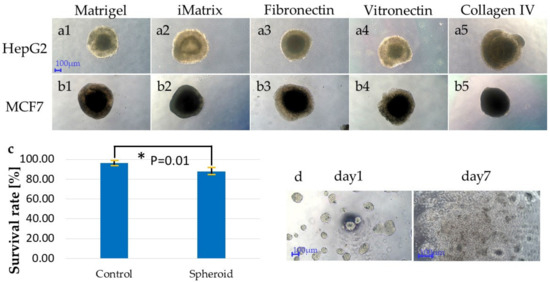 Spheroids derived from HepG2 or MCF7 cells after culturing in 2D for 7 days on different ECM substrates. HepG2 cells seeded on Matrigel (a1), Matrix (a2), fibronectin (a3), vitronectin (a4), and collagen IV (a5). MCF7 cells seeded on Matrigel (b1), Matrix (b2), fibronectin (b3), vitronectin (b4), and collagen IV (b5). (c) Viability confirmation by trypan blue staining. Student t-test was performed to compare the survival rates between the 2D and spheroid (p = 0.01). p value < 0.05 was considered statistically significant. Data are expressed as means ± standard deviations. The asterisks (*) indicate a statistically significant difference. (d) MCF7 on days 1 and 7 following the hanging-drop method.
