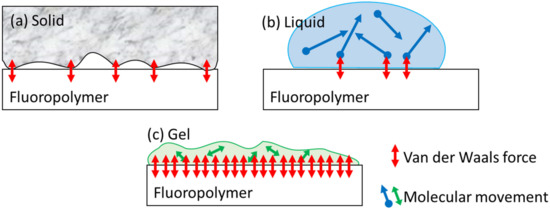 Application of force to the fluoropolymer depending on the state of the material placed on its surface. (a) Only point contact is possible due to the fine surface irregularities of solids, and thus, the area contributing to van der Waals forces is small. (b) Molecular motion in a spherically curled liquid as the surface tension exceeds the attractive van der Waals forces. (c) A gel with low surface tension and low fluidity is more densely packed, and the van der Waals forces act over a large area.