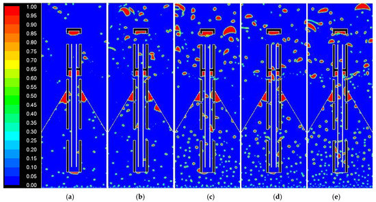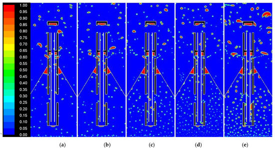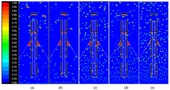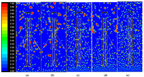 The DGLS’s gas holdup is 5%, and the water holdup is 95%. The flowmeter is placed in the central pipe. Therefore, as long as the gas holdup in the central pipe is lower than 10% of the total gas holdup at the wellbore inlet, it is considered to meet the engineering requirements. The gas holdup number in the central tube is brought into Equation (19), and then calculated the gas–liquid separation efficiency, i.e., the DGLS’s gas–liquid separation efficiency. As shown in Figure 4, the color chart for the vertical axis shows the phase’s volume content; red indicates that it is 100%, blue indicates that it is 0%. Figure 4a–e show a cloud diagram of the gas phase distribution in the casing when the total flow is 20 m3/d~60 m3/d. Red represents the gas phase and blue represents the water phase. In Figure 4a–d, when the fluid enters the wellbore, most of the gas–water two-phase flow’s flow pattern consists of finely dispersed gas in the water bubble flow (VFD G/W bubble flow). In Figure 4e, most of the gas–water two-phase flow’s flow pattern consists of dispersed gas in water bubble flow (D G/W bubble flow) and VFD G/W bubble flow. When the fluid continues to rise under the collecting umbrella, the stratification of the gas phase and the liquid phase occurs due to the varying density. After the gas phase accumulates to form a gas cap, we opened the exhaust valve and allowed it to enter the exhaust channel, so as to isolate the gas phase and the liquid phase. Then, we discharged the gas phase through the exhaust channel, and the gas–liquid two-phase flow’s flow pattern consisted primarily of bubble flow in water. With the increase in total flow rate, the bubble size at the inlet of the wellbore increased. Additionally, the bubbles discharged through the exhaust channel and gradually expanded but remained part of the G/W bubble flow. At the same time, observation of the central pipe showed that its gas content had also increased along with the increase in total flow.