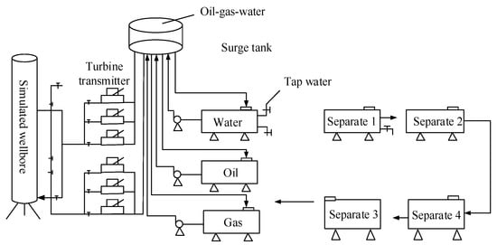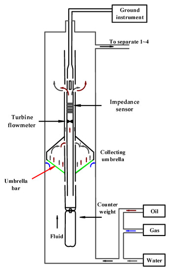 As one of the world’s three major energy sources, oil reserves and production have an effect on many countries’ economic development. Petroleum is a non-renewable energy source. With the increase in demand, petroleum reserves will decrease year by year. As such, the efficient development of petroleum resources has become a crucial research direction in many countries. Oil production in China is dependent on the exploitation of onshore oilfields. Fluid production profile logging technology [1,2] is a key link in oilfield production. Providing oil–water stratified production is integral to the efficient development of oilfields. However, during the high water-cut development period, formation pressure declines, natural gas is freed from the oil, and the wellbore is a three-phase flow of oil, gas, and water (the oil, gas, and water mixture flows upward under the aid of mechanical exploitation, and the gas exists in a free state). If we continue to use the original oil–water two-phase flow logging technology to measure the oil–gas–water three-phase flow, significant measurement errors are inevitable [3]. The gas phase has become one of the main problems affecting output profile measurement accuracy. In recent years, logging technology platforms built by overseas companies such as Schlumberger have explored the measurement of oil–gas–water multiphase flow in oil wells. However, most Chinese oil wells have low fluid production. Due to the uneven distribution of oil–gas–water multiphase flow distribution, and the slippage effect between the phases at low flow rates, it is difficult to measure the three-phase flow’s split-flow rate.