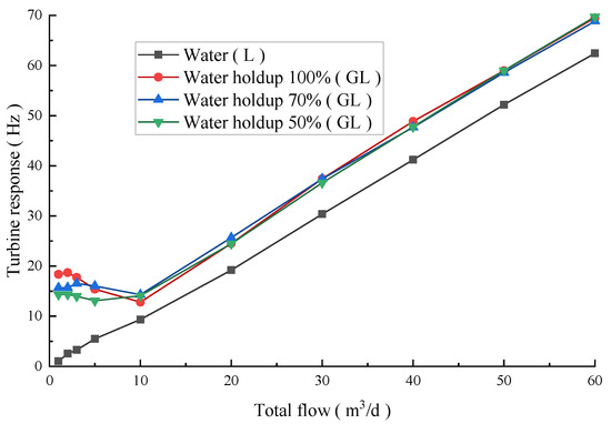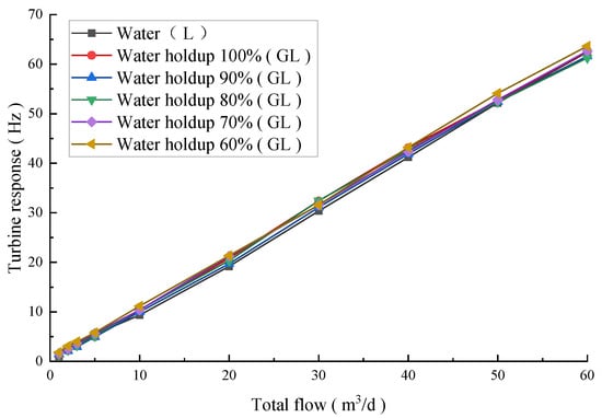 Figure 16 shows the turbine response curve at a gas flow rate of 15 m3/d. When the total liquid flow exceeds 10 m3/d, the curve shows a good linear relationship, but the response frequency at different water holdups is higher than at pure water. This indicates that a large amount of gas enters the central pipe, which affects the turbine flowmeter’s speed. The turbine’s speed when the medium is gas is different from that of when the medium is liquid. When the gas passes through the turbine flow meter, both the turbine speed and the output frequency increase. When the total liquid flow is less than 10 m3/d, the relationship between flow and frequency is nonlinear. This shows that the DGLS’s gas–liquid separation capacity is poor. The gas phase enters the central pipe instead of discharging through the exhaust channel. The gas phase makes the turbine flowmeter more sensitive to the gas phase, but the sensitivity to the liquid phase decreases. This affects the turbine flowmeter’s output characteristics. When the gas flow surpasses 15m3/d, the DGLS cannot produce a sufficient gas–liquid separation effect. Therefore, to produce the expected effect, the gas flow needs to be no more than 15 m3/d.