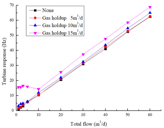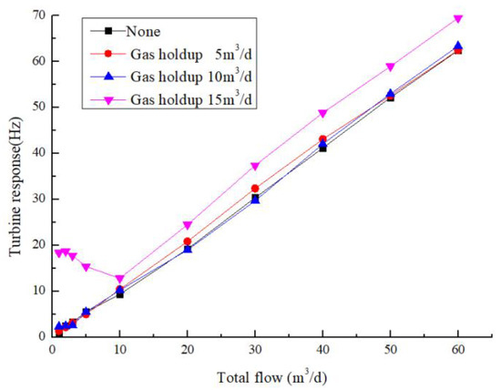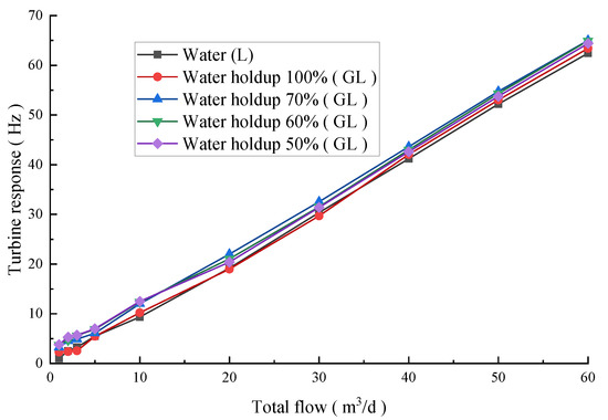 Figure 15 shows the turbine flowmeter’s response curve when the total gas-phase flow is 10 m3/d. With the increase in the total liquid flow, the turbine’s output still increases linearly. However, the frequency at different water holdups is higher than at pure water. This shows that some gas enters the central pipe, which affects the turbine flowmeter’s output frequency. However, this error is within the allowable range, and therefore the DGLS still provides good gas–liquid separation efficiency.