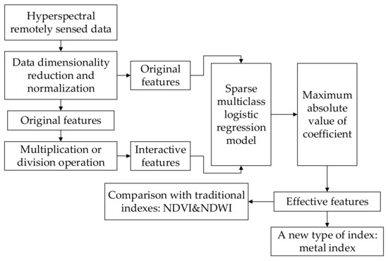 The key point of the method in this paper is explicitly to express the interaction relationship between original features as new features by multiplication or division operation in the logistic regression. This method automatically learns effective features based on data dimensionality reduction and normalization of hyperspectral remotely sensed images. Then the method uses these effective features as new indexes to extract ground features, subsequently compare them with the traditional indexes obtained by laboratory research. Meanwhile, a new type of metal index is proposed. Finally, the method of visual interpretation is used to evaluate the results, together with two indicators: OA (Overall Accuracy) and Recall. The overall technique flowchart is shown in Figure 1.