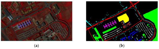 False-color composite map and ground truth information of the Pavia University data set: (a) False-color composite image; (b) Ground truth image.