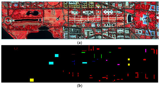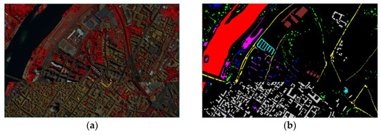 False-color composite map of Pavia Center and ground truth information: (a) False-color composite image; (b) Ground truth image.