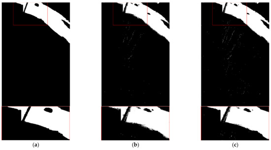 Extraction results of water body and partial enlarged image: (a) Ground truth information; (b) NDWI extraction result; (c) BAND32 extraction result.