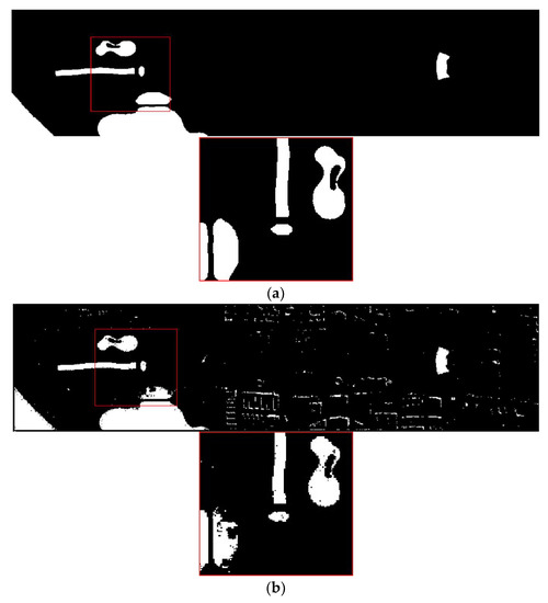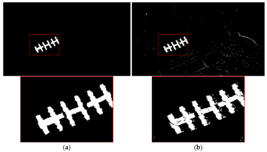 Extraction results of metal and partial enlarged image: (a) Ground truth information; (b) BAND22 extraction result.