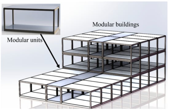 Modular building can maximize the prefabrication of building factories and improve the efficiency of building construction. In recent years, modular building has gradually replaced the traditional prefabricated building structure system in developed countries in North America, Japan and Europe, and it has been widely used in engineering construction [1,2]. The structural framework, maintenance wall panels and pipelines of the modular units are all prefabricated in the factory and transported to the site for assembly as shown in Figure 1. This process ensures the construction quality of modular units but also makes the modular connections become the most critical factor to ensure the overall structural stability and robustness. A state-of-the-art review conducted by Wahid Ferdous [3] pointed out that the development of multi-story modular buildings still faces the challenge of lack of design guidelines and reliable connection systems. In addition, a same conclusion can be drawn from the research of E. Brunesi [4,5] in seismic property of cast-in-place structure.