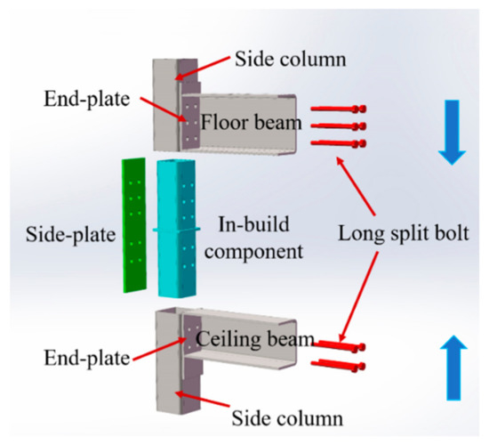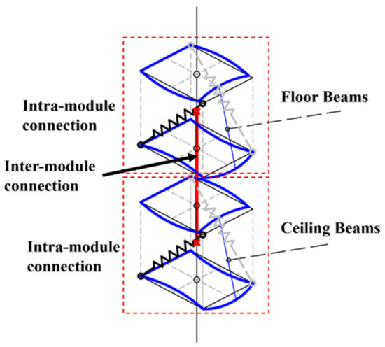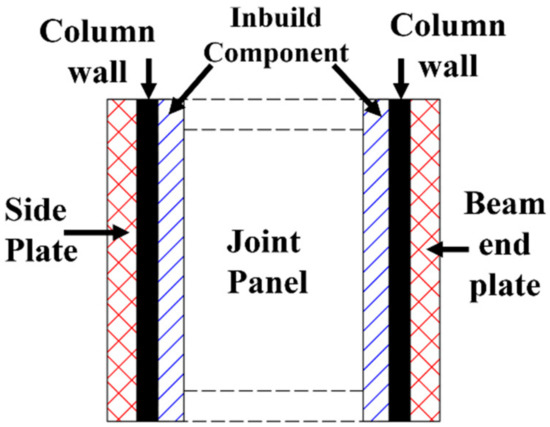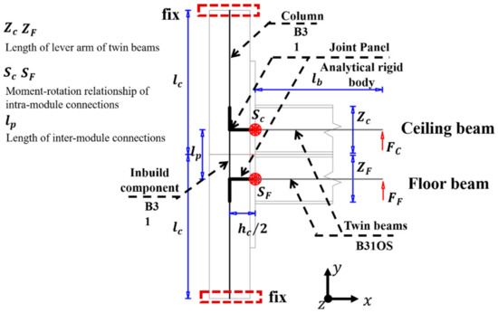 The aim of this paper is to develop a component-based model for novel modular connections with superimposed beams shown in Figure 2. The novel modular connection eliminated gaps between ceiling and floor beams in order to ensure more continuous force transmission between modular units. The basic mechanical properties of joints [23] and superimposed beams [24,25,26] were previously studied. In this paper, a more comprehensive parameter study was fist implemented using elaborate finite element models. We then followed the component method procedure: