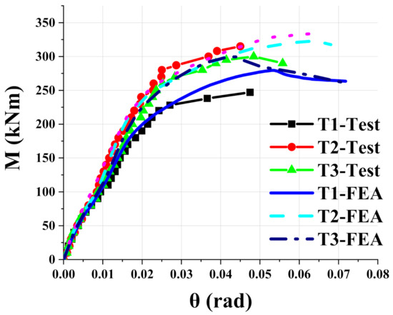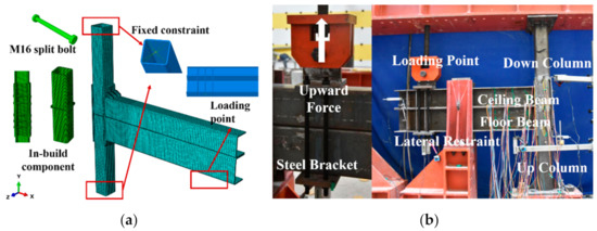 To ensure the logical integrity of the study, the finite element modeling procedure and validation were reviewed briefly. Three full-scale connections experiments were carried out to investigate the basic mechanical behavior. The dimension details and relevant number of specimens were shown in Figure 3 and summarized in Table 1. The reasonable modeling process is the premise to ensure the accuracy of the numerical model. According to E. Brunesi [27,28], a refined nonlinear solid FE model, accounting for the influence of friction, preload of bolts, relative slippage of components, could well reproduce the test result. The typical finite element model was shown in Figure 4a; the loading and support condition were exactly the same as the experiment (Figure 4b). All degrees of freedom on the top and bottom were constrained to achieve a fixed state. A z-direction constraint plane was set at the twin beams to simulate the out-of-plane restraint device in experiment. The bolts and nuts are simplified into cylinders of the same volume, and the pre-tightening force is applied using the “bolt load” method in the Abaqus. All contacts between components are modeled using the “surface-to-surface” algorithm. Normal contact is simulated by “hard contact” to ensure complete pressure transfer and allow separation after contact. Tangential contact is simulated by “penalty” with a friction coefficient of 0.3. All welded parts are modeled as solid units and “tie” to surrounding components. To ensure that the model can accurately simulate the local buckling behavior of the web and the flange of the beam, at least two layers of mesh are set in the direction of the thickness of all the member plates. The model was meshed using the C3D8R element with the size of 10 mm at the connection domain and 20 mm in other areas to speed up the calculation while ensuring accuracy. The model contained 94,594 elements and 143,067 nodes. The geometrical nonlinearities were considered through switching “nlgeom” on in Abaqus. Material nonlinearities were considered by plastic function in “material manger” in Abaqus. For more detailed material parameters, one can refer to the author’s previous articles [23]. In the experiment, the load was applied to test specimens through a particular steel bracket. It ensured that the upward displacement of floor and ceiling were equal. In the numerical model, the upward displacement was applied at the bottom flange of the floor beam to achieve the same effect as the experiment.