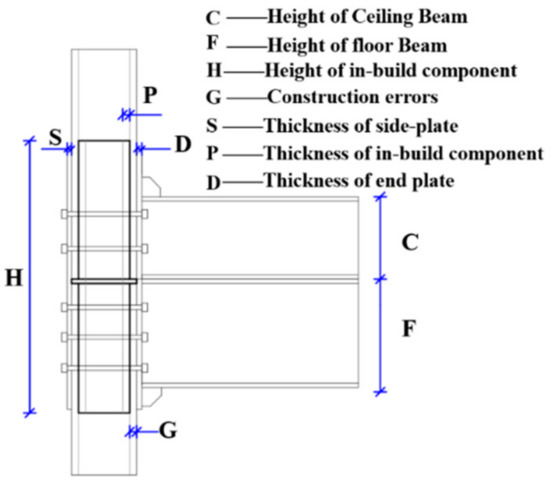 The parameters of novel modular connections were shown in Figure 6. According to the experimental results, the bending stiffness of floor and ceiling beams has great influence on the initial stiffness, ultimate strength and continuity of modular connections. In parameter analysis, models were named by F and C followed by beam heights. The reserved construction error between the build-in component and the column leads to the discontinuity of the upper and lower intramodule connections, which is one of the important sources of modular connection deformation between modular units. In the model, the size is represented by G followed by a number. The inbuild component is the main part of the intermodule connection, which can not only locate the position but also enhance the strength of joint panels during construction. The height and thickness of internal inserts are denoted by letters H and P, respectively. After inserting the inbuild component into the side column, the modular connection needs to be tightened by the side plate and split bolts. The thickness of the side sealing plate and the bolt pre-tightening force are respectively represented by S and BL. The beam and column inside the modular unit are welded together through an end plate, which will affect the mechanical properties of the global connections by affecting the strength of the intramodule connection. The thickness of the end plate is represented by D.