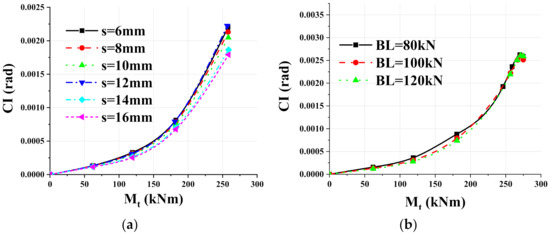 The influence rule of side plate thickness and bolts preload on relative dislocation between upper and lower columns were shown in Figure 9. When the moment is below 200 kNm, the curves almost coincide and increase linearly, indicating that the thickness of the side plate has little influence on the relative dislocation of the upper and lower columns in the elastic stage. When the bending moment reaches 200 kNm, curves entered into the elastic–plastic stage and began to separate. The higher the thickness of the side plate, the smaller the relative dislocation of the side columns. There is no significant difference between the curves with different bolt preload.