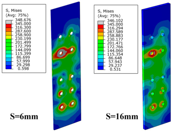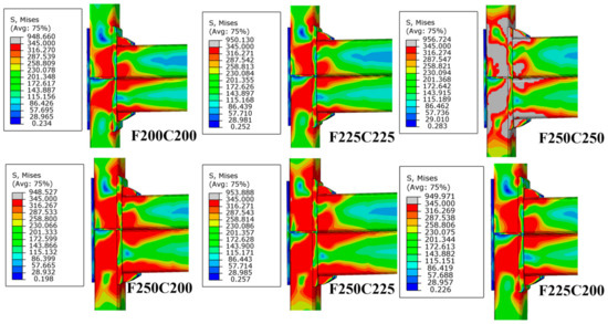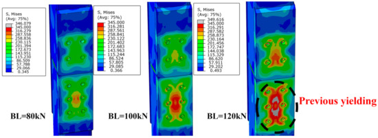In general, the thickness of the side plate has little influence on the overall moment-rotation curve of connections but plays a positive role in enhancing the continuity between modules. The Mises stress distribution of side plates with thickness of 6 mm and 16 mm is shown in Figure 11. The yield area of S16 was obviously smaller than that of S6, indicating that the plate with larger stiffness can prevent the relative dislocation of the lower and upper columns more effectively. The bolt preload has little effect on the global mechanical properties of the connection, but it can improve the continuity index in the elastic stage. However, if the bolt preload is too high, the column flange will enter the yield stage before vertical force is formally applied, as shown in Figure 12.