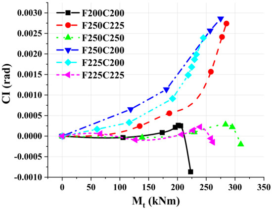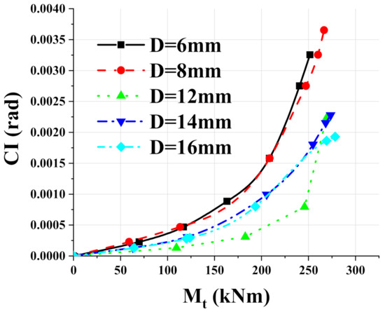 The continuity index curves of different end plate thicknesses were shown in Figure 15. It can be seen that the continuity index of D12, D14 and D16 models was significantly stronger than that of D6 and D8 models. Moreover, the curves of D12, D14 and D16 almost coincide, indicating that increasing the end plate thickness on the basis of the reference model have little impact on the continuity of connections.