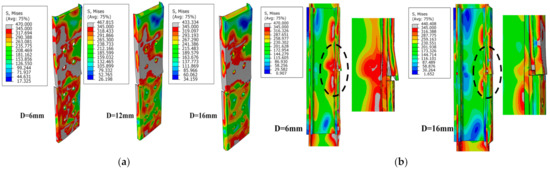 According to the above analysis, increasing the thickness of the beam end plate can improve the mechanical behavior and continuity of the connection. Mises stress distribution of D6, D12 and D16 models at the final loading stage was shown in Figure 16a, and the parts of stress over 345 MPa were indicated in gray. The yield area of the end plate with high thickness is small, which improves the ultimate bearing capacity of the joint. The stress distribution in the joint panel of D6 and D16 models at maximum moment is shown in Figure 16b. The end plate is connected with the column flange by welding. Increasing the thickness of the end plate is equivalent to improving the strength of the beam–column connection, and the initial stiffness of the global modular connection is improved by reducing the deformation of the column flange. At the same time, higher thickness of the end plate can better protect the inbuild component from local buckling under the ultimate load, thus improving the continuity of intermodule connection.