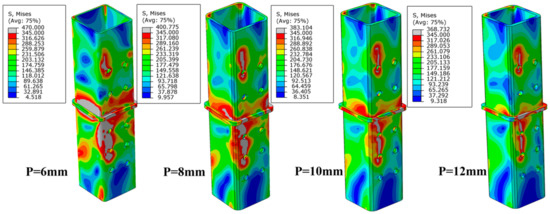The above analysis showed that the inbuild component thickness had greater influence on the connection mechanical properties than the height. The Mises stress distribution of inbuild component in models P6 to P14 was shown in Figure 20. The stress concentration area was mainly distributed at the junction of the upper and lower columns. The inbuild component wall of model P6 and model P8 revealed obvious depression in the stress concentration area, which could not continue to constrain the relative dislocation of upper and lower columns to improve the continuity of joints. The yield area of P12 and P14 was significantly smaller than that of the P6 and P8 models. The internal inbuild component still had potential to limit the relative deformation between columns.