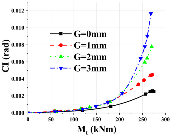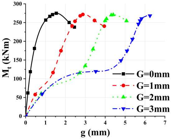 Figure 22 showed moment-dislocation (M-g) curves with different allowable errors, and there were significant morphological differences among the curves. In the initial stage of the G0 model (moment was less than 200 kNm), dislocation grows almost linearly and slowly. The curve of the G1 model increased linearly in the initial stage, and the slope was about 78% lower than that of the G0 model. When the bending moment reached 80 kNm, a slip segment of about 0.5 mm appeared in the curve, and then the curve continued to maintain a linear growth before 200 kNm. A 1 mm horizontal slip segment appears at around 80 kNm of the G2 model, and then the curve changes back to a linear growth mode. The G3 model curve almost overlaps with the G2 model in the initial stage. When the bending moment reached 100 kNm, the curve showed a slip segment of about 3 mm. The dislocation of the G1, G2 and G3 models were 2.9 mm, 4.4 mm and 6.2 mm at ultimate moment, which were 86.6%, 185.5% and 305.3% higher than that of the reference model G0, respectively. The construction error has a significant effect on the relative displacement of the upper and lower columns.