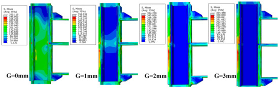 Rotation difference-moment curves of the G0 to G3 models were shown in Figure 23. Before 100 kNm, the curves of the G1, G2 and G3 models almost coincide and are higher than those of the G0 model, indicating that the continuity of connections with construction errors in the elastic stage was similar and weaker than that of the model without admissible errors. When the bending moment was greater than 200 kNm, the curves of the G2 model and the G3 model showed a divergent trend, and the rotation difference continued to increase, while the G0 model and the G1 model remained at a low level. Through the above analysis, it is found that the construction error has great influence on the initial stiffness, the dislocation and the continuity of the connection. Mises stress distribution at each connection was shown in Figure 24 at the moment of 100 kNm. For the G0 model, the inbuild component was closely attached to the column wall, which increases the strength of the joint panel and thus improves the initial stiffness of the node. For the G1 to G3 models however, the stress distribution still remains in a low level, indicating that the connection was in a “slip” stage.