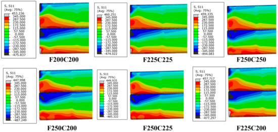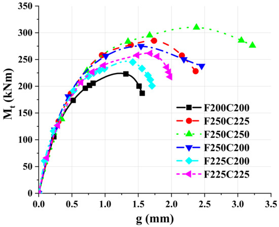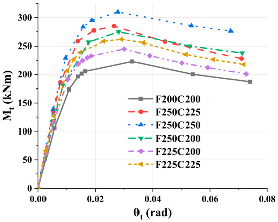 Different from traditional assembly joints, modular building joints consist of two beams. Many studies proved that the height ratio between floor beam and ceiling beam has significant influence on the mechanical properties of modular connections and systems. In order to better understand the influence of geometric dimensions of double beams on mechanical properties of joints, six groups of finite element models were set up under the premise that geometric dimensions of floor beams were no less than that of ceiling beams. F200C200, F225C200, F225C225, F250C200, F250C225 and F250C250 were considered, among which F250C200 was the reference model. The result moment-rotation curves were shown in Figure 25. Compared to the reference, the initial stiffness of F250C225 and F250C250 models increased by 16.6% and 19.9%, respectively, and the ultimate moment bearing capacity increased by 3.63% and 12.7%, respectively. F225C200 and F200C200 models reduce the height of floor beams on the basis of the reference model. The initial stiffness was reduced by 2.4% and 18.2%, respectively, and the ultimate bearing capacity was reduced by 10.9% and 18.9%, respectively.