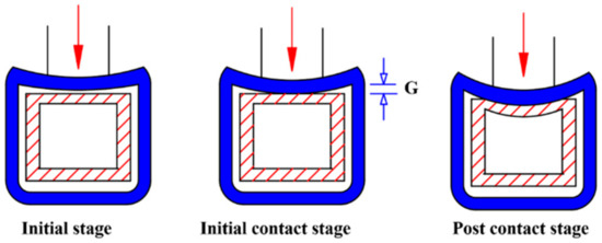 Taking the allowable construction errors into consideration, the interaction mechanism was shown in Figure 38. The deformation mode can be divided into three stages. In the initial stage, the column face was bent under the action of compression force, but it had not contacted the inbuild component, so the mechanics of the component coincide with that without the inbuild component. In the second stage, the deformation of the column wall reached the construction error G; the inbuild component began to provide support for the converged section components. In the third stage of stress, the column face and the inbuild component were cooperating to deform. The inbuild component continued to provide support for the column.