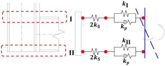 Based on the above analysis and the research of L.M. Gil-Martín [31], the calculation model of intramodule connection was shown in Figure 40. When considering the independent mechanical properties of intramodule connections, the spring of inbuild component () needs to be removed. The significance of discussing the independent intramodule connection lies in the design of mechanical properties of modular units before assembly (such as transportation and hoisting et al.). According to the simplified rule of spring in series and parallel, the spring group in I area can be simplified to a single spring with stiffness of and ultimate resistance of ; the spring group in II area can be simplified to a single spring with a stiffness of and ultimate resistance of . Therefore, the initial rotational stiffness and ultimate bending moment of intramodule can be expressed as