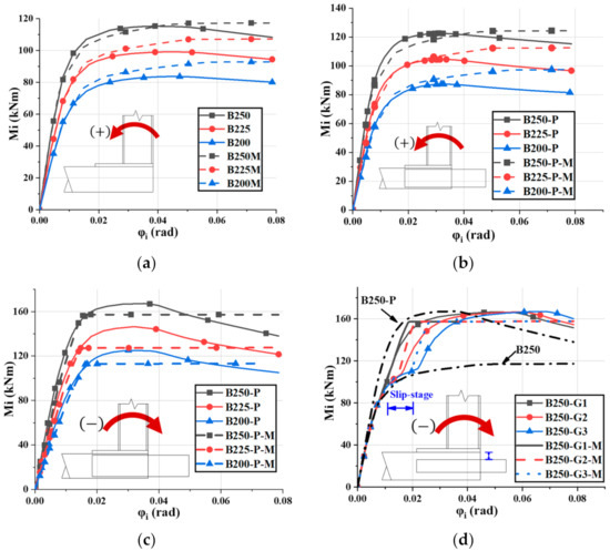 Moment-rotation curves of intramodule connections: (a) Under positive bending moment without inbuild component; (b) Under positive bending moment with inbuild component; (c) Under negative bending moment with inbuild component; (d) Under negative bending moment with inbuild component and take construction errors into consideration.