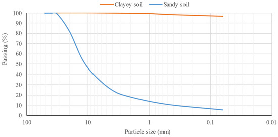The sandy soil comes as a reject from a crushed gravel production quarry located near Villacarrillo. The rejects are subjected to a sieving process to achieve a particle size within the parameters of Spanish regulations [34]. Table 1 shows the physicochemical properties of the two soils analysed, and Figure 2 shows the granulometric curves of the soils.