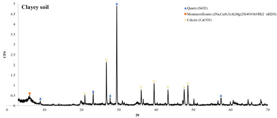 Regarding the composition of the soils, an analysis of the major compounds by X-ray fluorescence (XRF) and mineralogical analysis by X-ray diffraction (XRD) was carried out, as shown in Table 1 and Figure 3 and Figure 4.