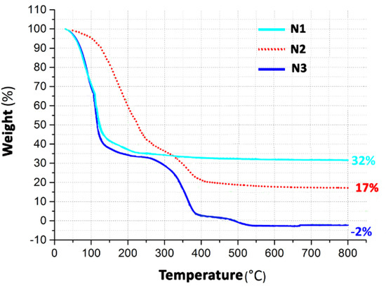 The results of the TGA analysis are shown in Figure 5. In N1, a progressive weight loss was observed of up to 200 °C, which was due to the loss of water in the nanosilane. This nanomaterial showed a high silica content of 32%. N2 showed a higher weight loss; the silica content at 400 °C was 17%. N3 completely loses its mass at a temperature of 400 °C.