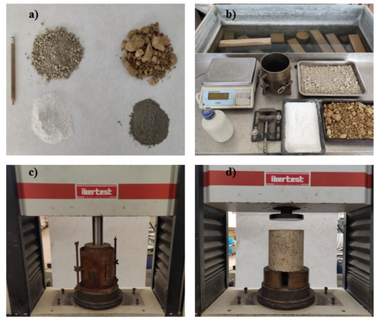 Experimental methods and materials photographs. (a) Soils and binders. (b) Modified Proctor test. (c) CBR index test. (d) Unconfined compressive strength test.