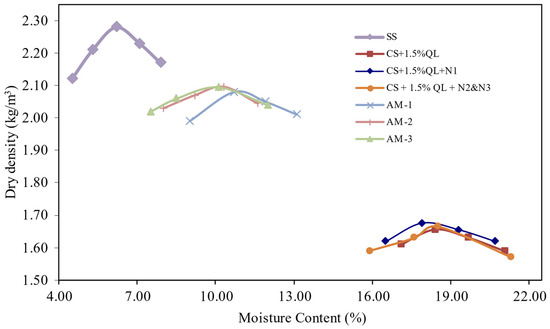 Analysing Figure 7, SS shows the highest maximum dry density, 2.28 kg/m3, and minimum optimum moisture content, 6.2%, likely due to its physical properties, such as a higher quantity of coarse particles and its higher density. However, CS stabilised with lime and quicklime plus nanomaterials show values contrary to SS due to the clay gradation, which is composed mainly of fine particles and its great absorption of water, which is a typical characteristic of expansive soil.