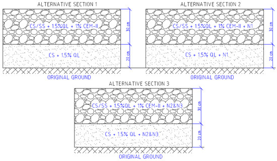 According to the results obtained by Rosales et al. [32], three alternative sections composed of two layers were proposed: one of lime stabilised expansive clayed soil (CS) and another upper one of a mixture of CS and sandy soil (SS) stabilised with cement.