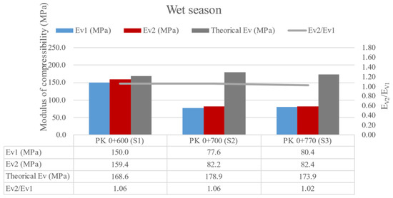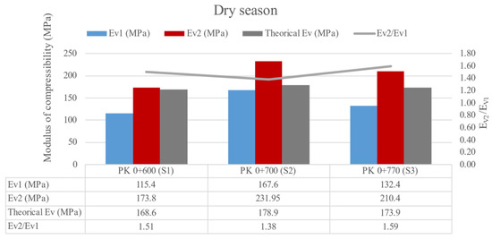 Additionally, the evolution of the Ev2/Ev1 ratio was shown, limited by Spanish specifications to 2.2, a limitation that was met by all sections in both the dry and wet seasons.