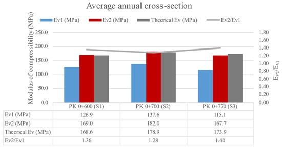Table 8 shows the average annual deflection of each section, as well as the weighted deflection for a load of 500 kPa, which enables calculating the elastic modulus through Equation (4).