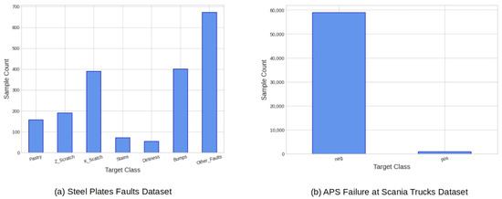 The APS Failure at Scania Trucks dataset [61] has a misclassification cost metric whose objective seeks to minimize the number of false negatives. In particular, false positives (Type I errors) associated with unnecessary checks performed by a mechanic at the workshop bear a penalty cost of 10 each while on the other hand, false negatives (Type II errors), associated with missing a faulty truck and eventually leading to a breakdown, bear a penalty cost of 500 each. The dataset consists of sensor data collected from APS equipment in heavy Scania trucks mapping out their everyday usage. The result is a labeled dataset in which the positive class represents failures from a specific component in the APS [61]. However, the dataset is extensively imbalanced, with the negative class vastly outnumbering the positive class (see Figure 4b). In addition, the dataset features missing values for some attributes due to sensor failures, making it unsuitable for most of the Multivariate Statistical Process Control (MSPC) methods [63,64,65].