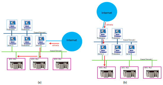 Figure 3. Two types of attack: (a) horizontal—between devices of the same subnetwork; (b) vertical—through subnets. - In the next step, the attacker blocks legitimate users to make system recovery difficult or impossible (e.g., by changing the password, overusing PLC resources, or changing the IP address of the controller). Different locking methods allow different degrees of success.