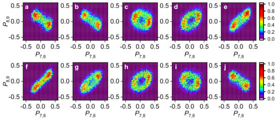 Experimental correlation plots for a phase scan using PS in the three-harmonic case. (a–j) Evolution of the correlation plots of the oscillating components of the sidebands for increasing values of the delay introduced by the phase shifter PS. The delay introduced by the phase shifter PS affects the phase of the harmonic H. The color scale indicates the density of single-shot experimental points normalized to unity for each panel.