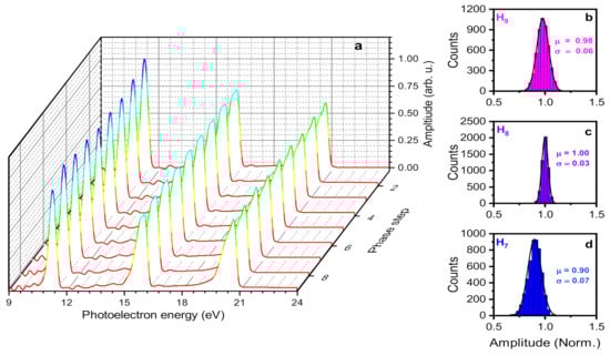 In Figure 3a, the energy spectrum of the harmonics is presented for different phases in a phase scan without the NIR dressing field. Panels b–d display the distribution of the shot-to-shot amplitudes of the individual harmonics for a fixed delay of PS and PS. The amplitudes are evaluated as the square root of the area under the corresponding peaks. For the reconstruction, it is sufficient to consider the relative amplitudes of the harmonics, and hence, we normalized the distributions of the harmonics with the mean value of the H amplitude. The mean () and the standard deviation () of the harmonic amplitudes are displayed in the panels showing the distribution of the harmonics H (b), H (c), and H (d). The evolution of the correlation plots in a phase scan and a negligible effect of phase variation on the harmonic amplitudes suggest the possibility of a more advanced complex attosecond waveform synthesis.