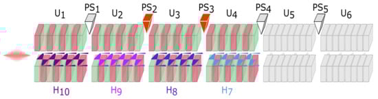 Undulator configuration for the four harmonics’ generation. Each harmonic is generated using one undulator. H is generated by the undulator U; H is generated by the undulator U; H is generated by the undulator U; H is generated by the undulator U. The phase shifters used to conduct a phase scan are indicated in red.