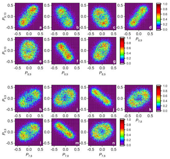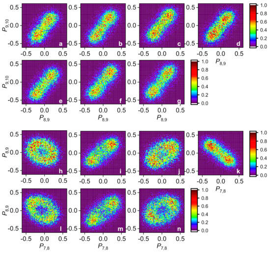 In Figure 7, the correlation plots of the two pairs of oscillating components corresponding to different phase difference values are displayed. Panels a–g (i–n) show the evolution of the correlation distribution of the oscillating components and ( and ). The phase scan was carried out at a fixed PS value corresponding to Figure 5d. The delay introduced in each step was 31.45 as, corresponding to a reduction of 1.57 rad in each step. The correlation plots of the oscillating components () do not show a variation in the correlation distribution as the delay is varied. An addition of four delay steps corresponds to a reduction of 6.28 rad in . From Panels h–n, a periodic repetition of the correlation distribution for every four panels can be observed. These results demonstrate the possibility to selectively manipulate the phase difference in waveform shaping. The power of attosecond waveform synthesis to vary the phase of the harmonics of the harmonic comb independently allows the investigation of different dynamics dependent on the phase of the input radiation.