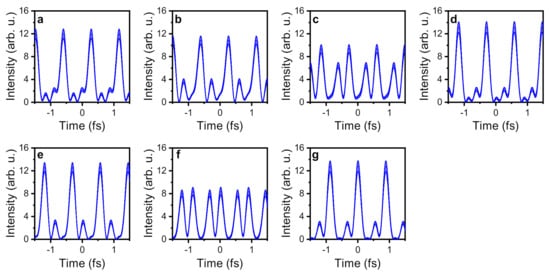 Similarly, for the evolution of the correlation plot of () from Panels j (k) to m (n), the total phase added is equal to 6.06 rad, reproducing a correlation plot in close similarity to Panel j (k). The phase differences and were obtained following the method described in [,]. From the amplitudes of the harmonics () obtained from the photoelectron spectra in the absence of the dressing NIR field, the intensity profile of the attosecond pulse trains is calculated using the equation: