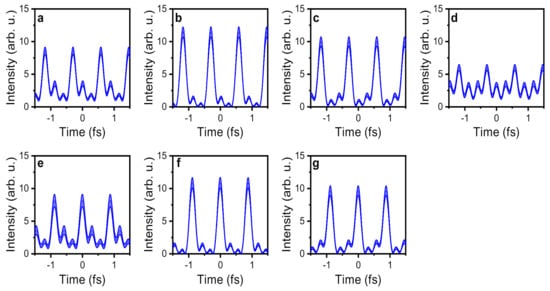 Reconstructed attosecond pulses corresponding to Figure 5 are displayed in Figure 6. The pulse duration () for each harmonic is considered equal and taken to be 50 fs FWHM []. From the equation, the shortest attosecond pulses result when both the phase difference terms and are ≈0. Panel d displays the shortest attosecond pulses with a pulse duration of 216 ± 7 as FWHM with the error in the pulse duration calculated from the error in the extracted phase differences and the obtained amplitudes of the harmonics. As expected from the equation of the intensity profile, the shortest waveforms (Figure 6d) result when the correlation plots of the oscillating components present a correlation distribution close to a straight line with a positive slope. When the distribution of both the correlation plots presents a nearly straight line inclined at a negative slope, a double structure is observed in the attosecond waveform (Figure 6c,f). The values of the phase differences and the harmonic amplitudes used for the reconstruction are provided in Table A1 of Appendix A.