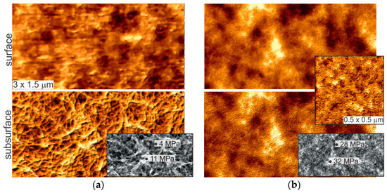 Surface and subsurface of untreated (a) and 30 s treated in argon plasma (b) polyurethane. The insets show maps of the elastic modulus of the subsurface structure. The lighter areas correspond to the stiff objects. The elastic moduli of the typical soft and stiff areas of the surface are marked.