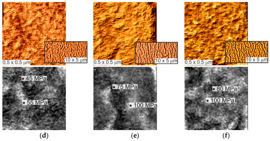 The surface changed insignificantly after a short treatment in Ar/C2H2 plasma (Figure 2a); the cellular nanostructure is preserved, but the surface stiffness becomes higher and more heterogeneous. Longer treatment times lead to the formation of a coating with structural and mechanical inhomogeneities (Figure 2b,c), where mesh-like areas alternate with smooth areas. The mechanical uniformity of the coating grows; the stiffness of the soft areas increases and approaches the elastic modulus of the stiff areas. The mismatch between surface and substrate stiffness is the reason for the folded topography (see insets in Figure 2), due to the loss of stability of the hard layer on the softer substrate. Argon post-treatment (Figure 2d–f) affects the surface roughness, partially destructs the mesh-like structures, and slightly increases the elastic modulus of the surface.