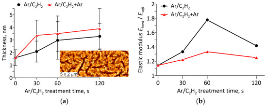 The contrast of the elastic modulus of Ar/C2H2-modified surfaces is related both to inhomogeneities of the polymeric substrate and to the non-uniformity of the coating at the initial stage of its formation. The highest scattering of local stiffness is achieved after 60 s of Ar/C2H2 treatment (Figure 3b). The argon post-treatment smooths the mechanical properties of the surface; the ratio of hard/soft modulus becomes less pronounced. Note that the modulus of the initially softer areas grows fast, and the modulus of the initially stiff areas increases insignificantly.