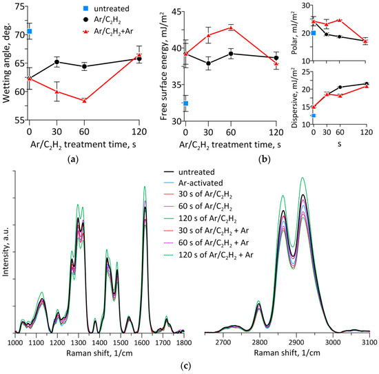 In comparison with pristine polymer, plasma treatment increases wettability (Figure 4a) and free surface energy (Figure 4b). The values for Ar/C2H2 are slightly worse than after initial argon activation, but the post-treatment by argon leads to a significant decrease in the water contact angle (and rise in free surface energy) for the materials with 30–60 s of Ar/C2H2 treatment. The increase in free surface energy is due to the dispersion component of the energy (Figure 4b), which is determined by the action of van der Waals interactions. The polar part of the energy (dipole interactions and the energy of hydrogen bonds) decreases as Ar/C2H2 treatment time grows. However, argon post-treatment boosts the polar component at the interval of 30–60 s of Ar/C2H2 treatment.
