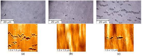 Only one material (60 s of Ar/C2H2 treatment, Figure 6b) has no strain-induced cracks at all. This can be explained by the presence of pronounced stiff and soft areas on this surface (Figure 3b); such stiffness mismatches similarly to filler in a polymeric composite and redistributes a load. The rest of the cases show nanocracks (Figure 6a) accompanied by individual microcracks (Figure 6d,e) or a network of microcracks (Figure 6c–f). The increase in the density of cracks is associated with a rise in the elastic modulus of the coatings, as well as with local mechanical inhomogeneities (Figure 2 and Figure 3b).